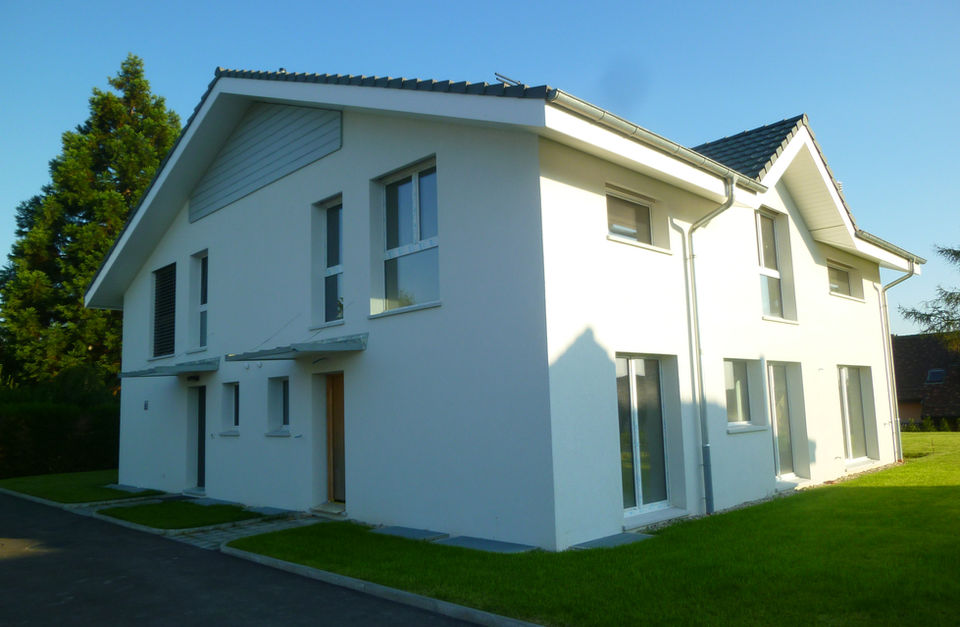 Construction de 2x2 villas jumelles en ossature bois de 6.5 pièces d'environ 150m2 avec sous-sol entièrement excavé, pompe à chaleur, triple vitrage, chauffage au sol et panneau solaire pour production d’eau chaude sanitaire.