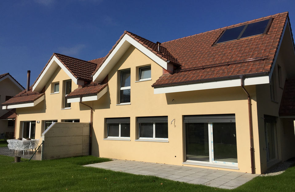 Construction de 2x2 villas jumelles en ossature bois de 5,5 pièces avec sous-sol, couvert à voiture, terrasse, pompe à chaleur, triple vitrage, chauffage au sol et panneau solaire