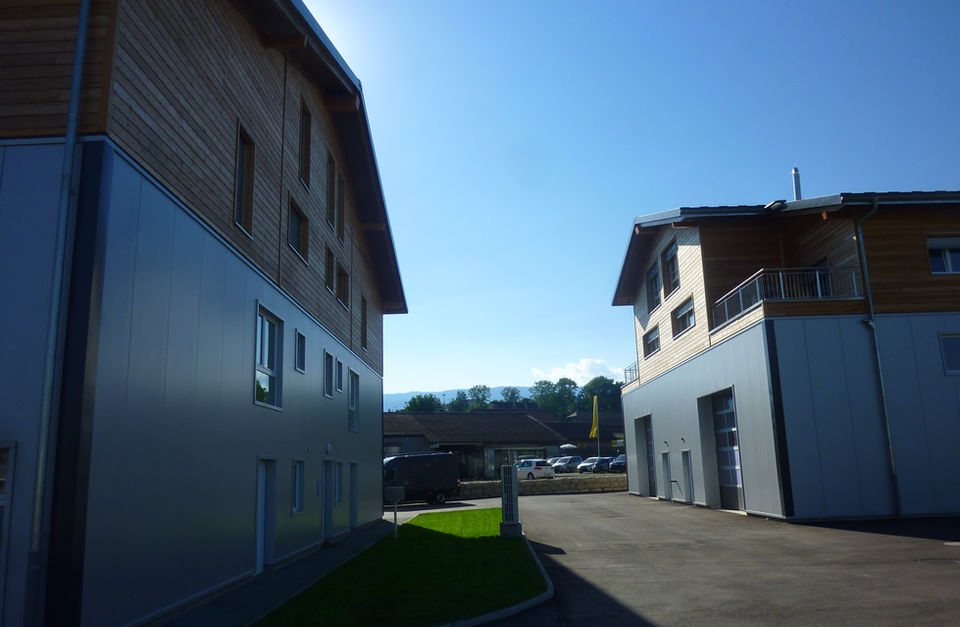 Construction de 4 halles en béton armé et ossature bois avec surface bureau et appartement.